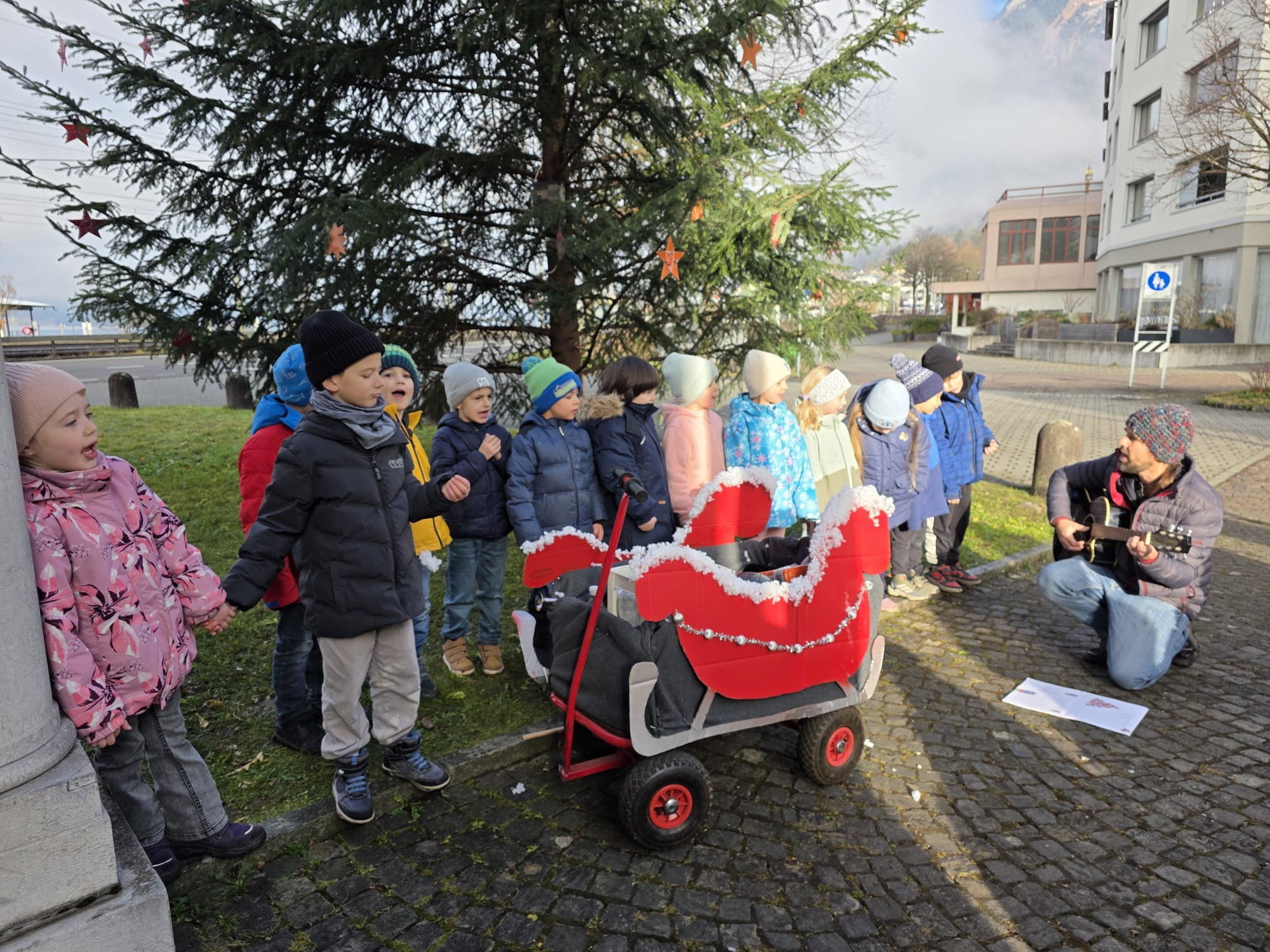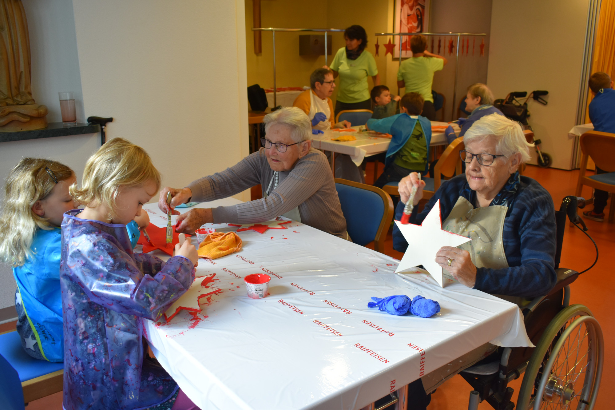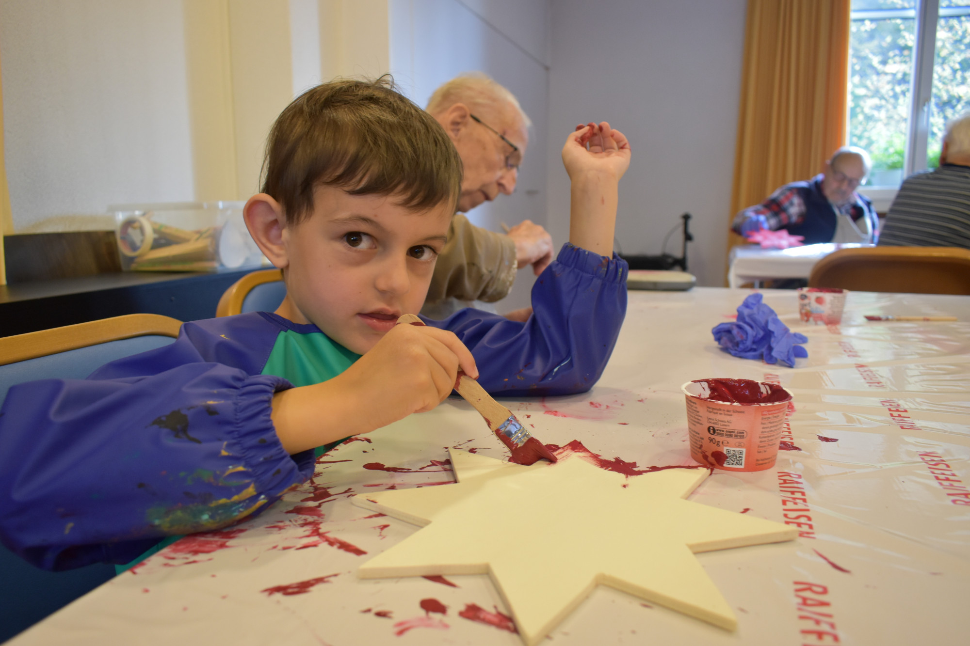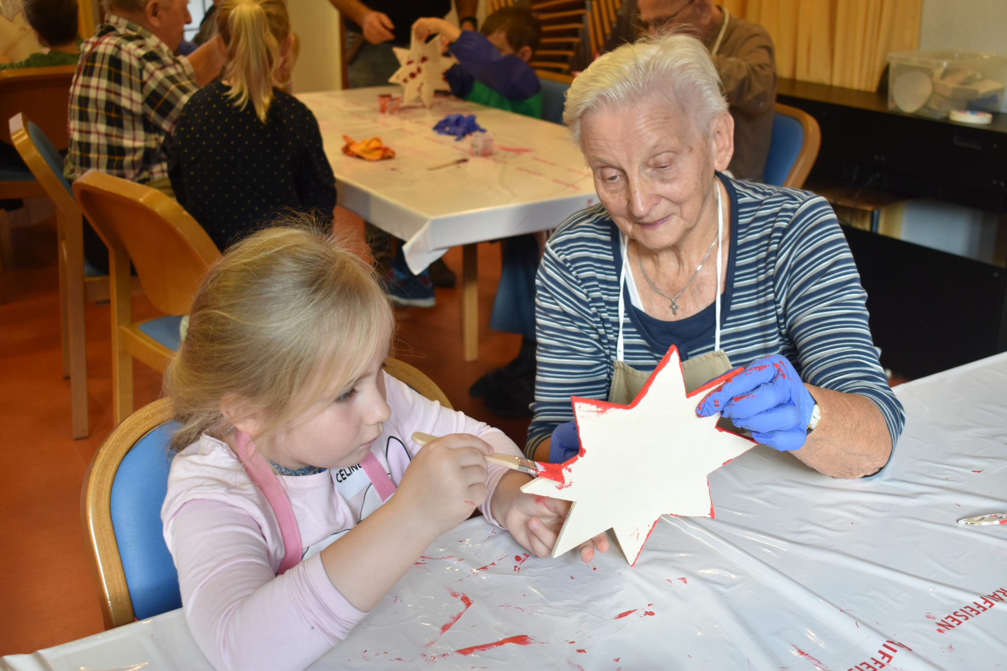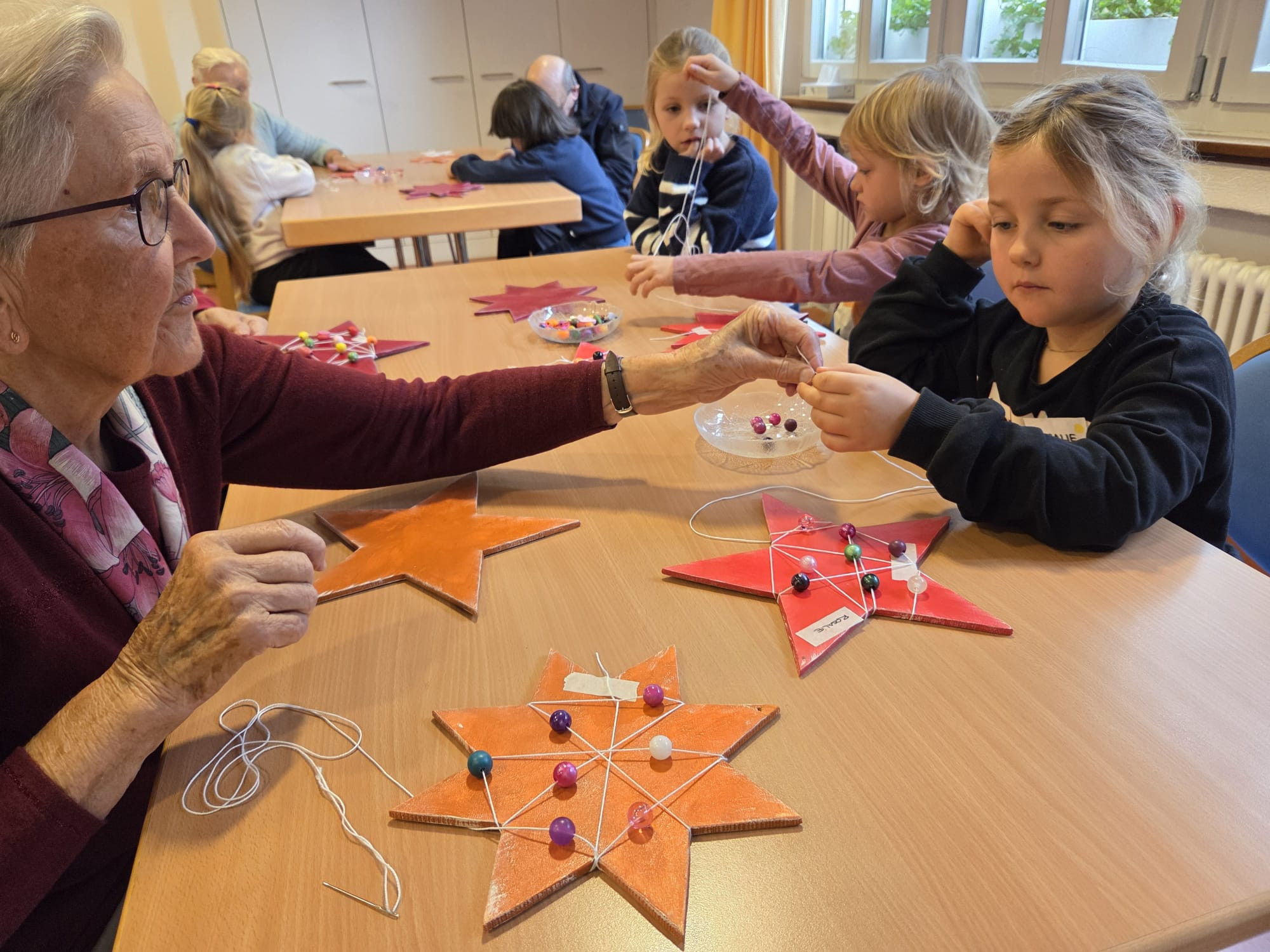 Beim ersten Treffen bemalten wir nach einem kurzen Kennenlernspiel die vorbereiteten Sterne. Beim zweiten Besuch wurden sie dann verziert – es wurde gelacht, erzählt, geholfen aber auch ganz konzentriert gearbeitet. Das dritte und letzte Treffen bildete einen stimmungsvollen Abschluss: Gemeinsam spazierten wir von der Seerose zum geschmückten Weihnachtsbaum der Gemeinde, wo ein kleiner feierlicher Akt stattfand, der das Projekt wunderbar abrundete.